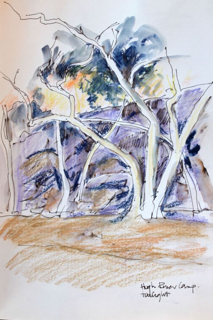 Hugh River Camp twilight Published August 1, 2012 at 854 × 1280 in Larapinta Trail Sketchbooks The magic of swags and a dry river bed Like Loading...