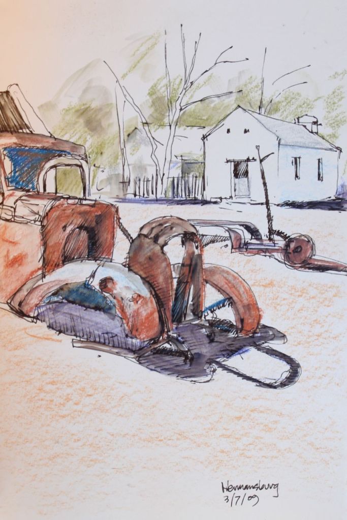 Hermansburg Published August 1, 2012 at 854 × 1280 in Larapinta Trail Sketchbooks The end of our trail (this trip) and for me a very unsettling place. Like Loading...