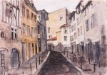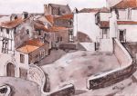 These works were all done in situ, using reed pen and sepia ink, ink wash, and pastel with acrylic medium on primed canvas. They are all A3 in size for portability (two are 2 x A3 panoramas). The locations depended pretty much on finding somewhere to sit down, so they really are a random sample of the place.
