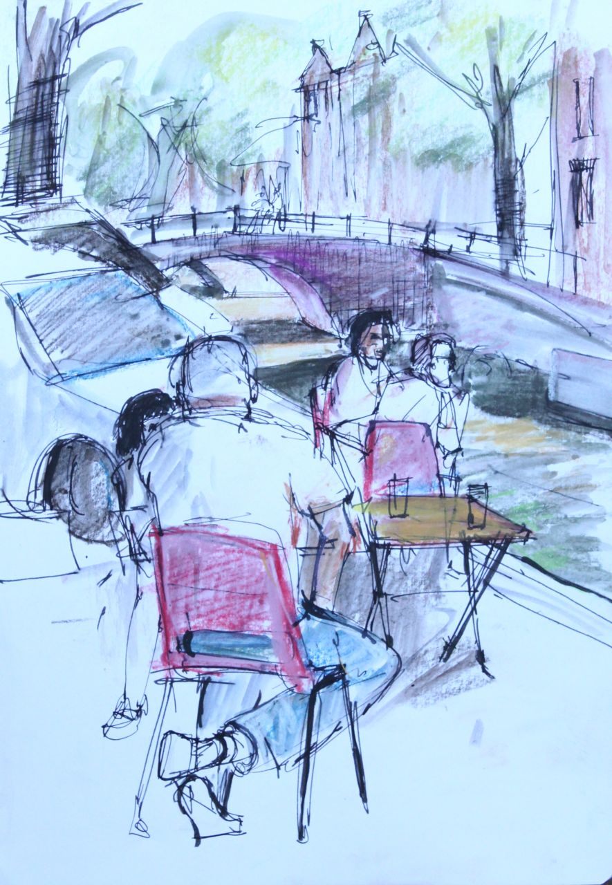 IMG_1841 Published October 15, 2012 at 885 × 1280 in Amsterdam sketchbook A beer by the canal Canal boats managed to fit through the narrow canal beside us, alarming the ducks and swans with their wake. Like Loading...
