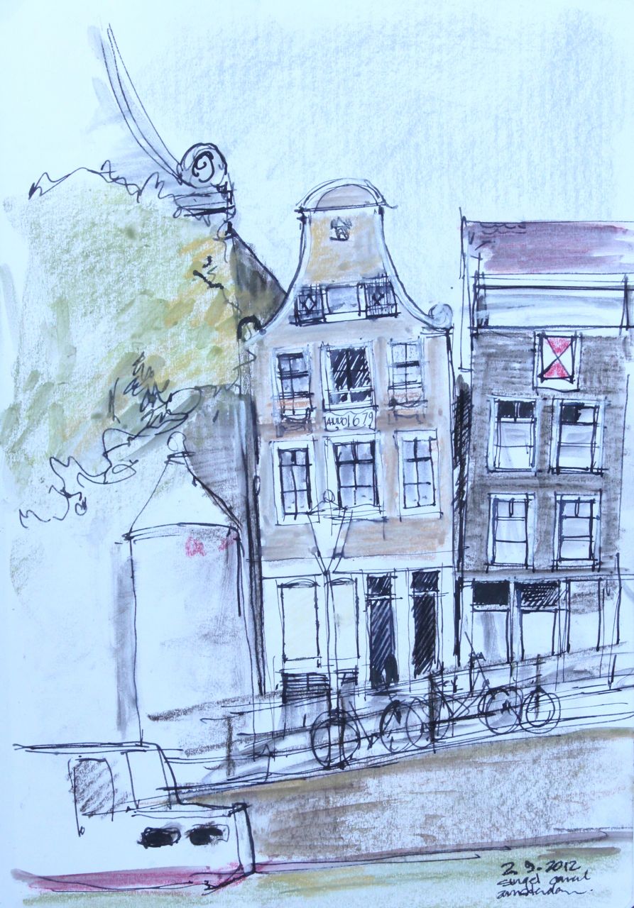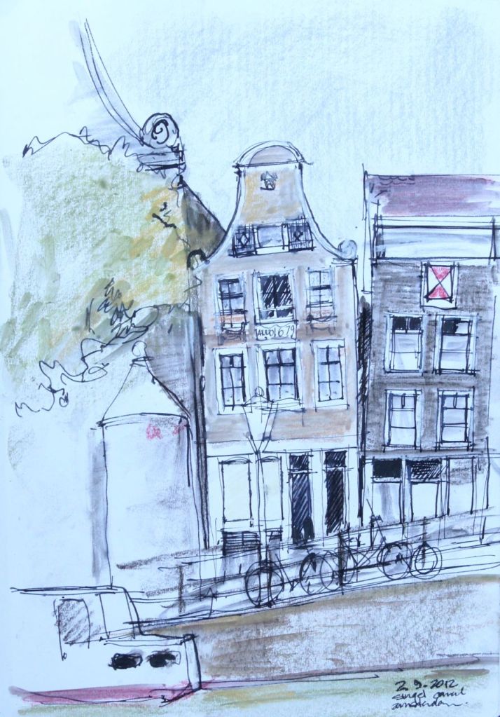 IMG_1845 Published October 15, 2012 at 893 × 1280 in Amsterdam sketchbook Leaning houses The timber piles supporting the brick buildings of Amsterdam keep moving, leading to some alarming tilts on these 4 storey houses. Like Loading...