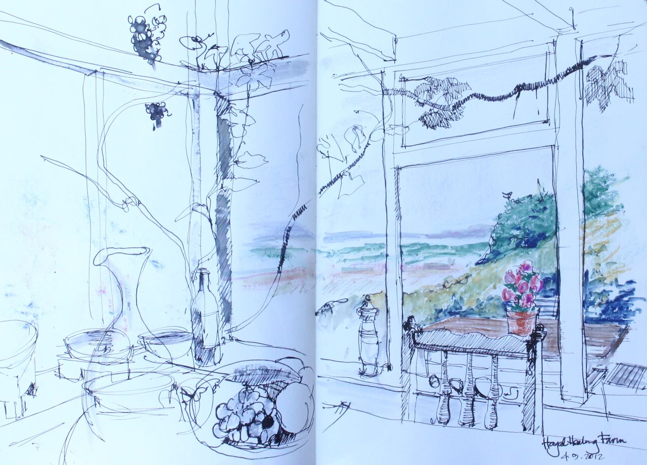 IMG_1850 Published October 15, 2012 at 1280 × 921 in Ireland Sketchbook Hagal Healing Farm The glass house is where we eat, looking out over Bantry Bay (on a clear day). The grapes are bearing heavy, sweet bunches around us, the food is cooked straight from the garden. Like Loading...