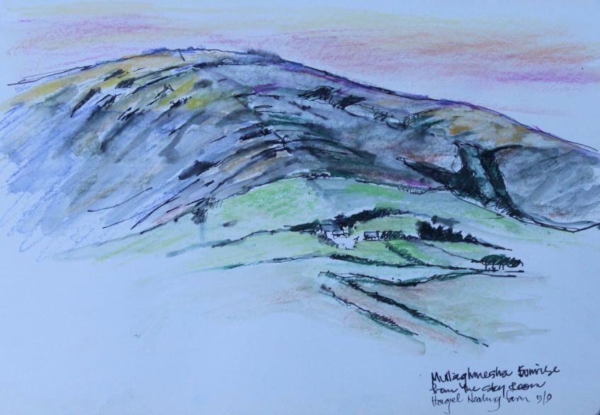 IMG_1854 Published October 15, 2012 at 1280 × 886 in Ireland Sketchbook Mullaghmesha Sunrise This hill is across the valley from Hagal Healing Farm. Usually it is obscured by cloud in the mornings Like Loading...
