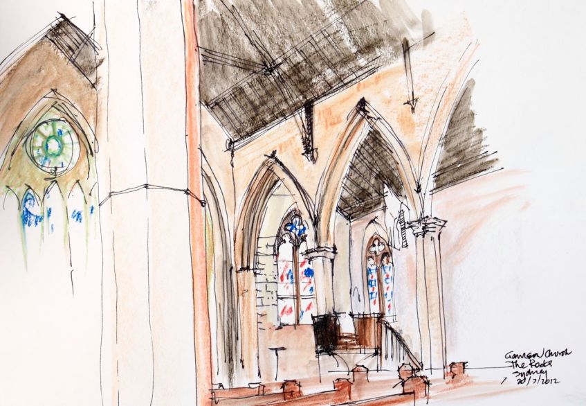 garrison church Published July 22, 2012 at 1280 × 886 in Lord Howe Island Sketchbook We learnt of the death of one of our great friends when we left Lord Howe. He did a lot of work on the lovely church in the Rocks, Sydney. We sat and thought of him. Like Loading...