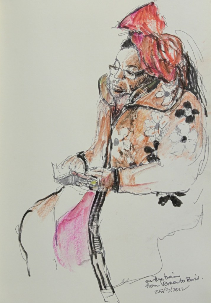 PAR17 Published October 17, 2012 at 892 × 1280 in Paris Sketchbook on the train- Giverny to Paris This striking lady was rugged up with many layers despite the warmth in the train. She was very content reading and talking to herself. Like Loading...